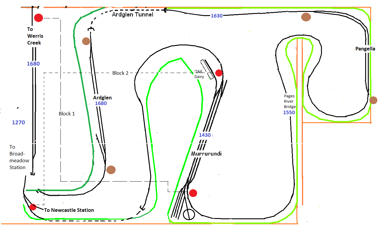 Now that there’s scenery on the Main North, there is more running of trains. There have been a few “cornfield meets” on the 40 metre (130 feet) single line, from Broadmeadow as it “winds up” to Werris Creek, due to the “physicals” of the layout with the 3 peninsulas restricting the operators view of what’s happening elsewhere on the layout, shown it the diagram below.