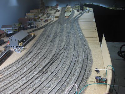 Gosford Yard has 10 Points that'll be under the Overhead & I intended using this method. I installed 15 more of the Rods/Tubes then added the Ballast, using Chuck's Martins Creek that's no longer available. adding the Slide Switches after the ballast dried (shown left). Note the "test" Peco Point motor is in the foreground.